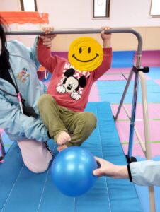 ぶら下がった体勢から目の前のボールや風船🎈をめがけてキックをします!!